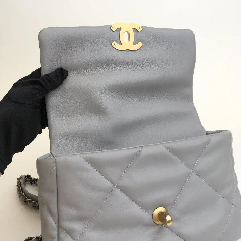 The Chanel 19 Flap Bag in medium grey lambskin is a perfect blend of luxury and modern style. Crafted from soft quilted leather, it features the iconic CC logo clasp and a mixed-metal chain strap for versatile wear. With a spacious interior and timeless design, this bag is ideal for elevating any outfit. A must-have for fashion lovers!