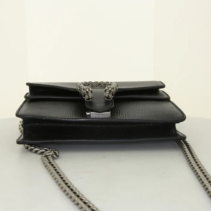 Add a touch of luxury to your wardrobe with the Gucci Dionysus Mini Crossbody Bag. Crafted from premium materials, this compact bag features the signature textured tiger head closure and sleek silhouette, perfect for carrying essentials in style. Its versatile chain strap allows for both shoulder and crossbody wear, making it ideal for day-to-night occasions.